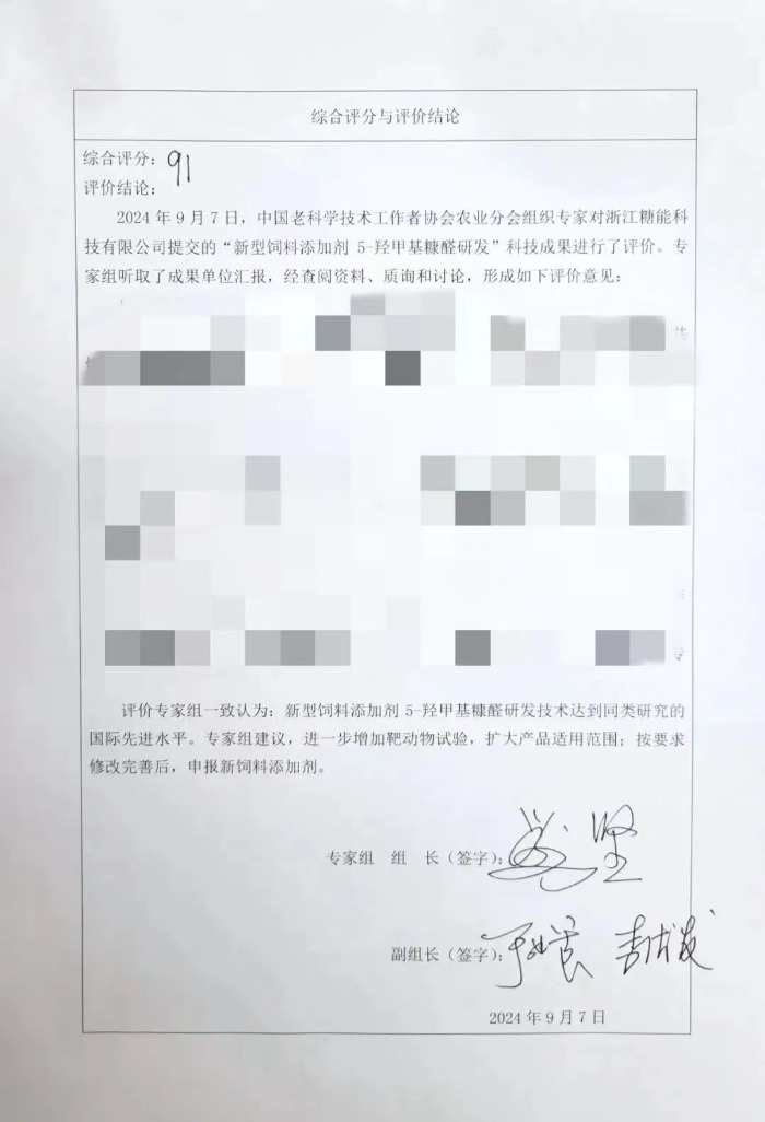 7 Eylül 2024'te, Zhejiang Sugar Energy Technology Co., Ltd. tarafından sunulan "Yeni bir yem katkı maddesi olan 5-hidroksimetilfurfural araştırma ve geliştirmesi"nin bilimsel ve teknolojik başarıları, Çin Birliği Tarım Şubesi tarafından düzenlenen uzman değerlendirmesini geçti. Kıdemli Bilim Adamları ve Teknisyenler.